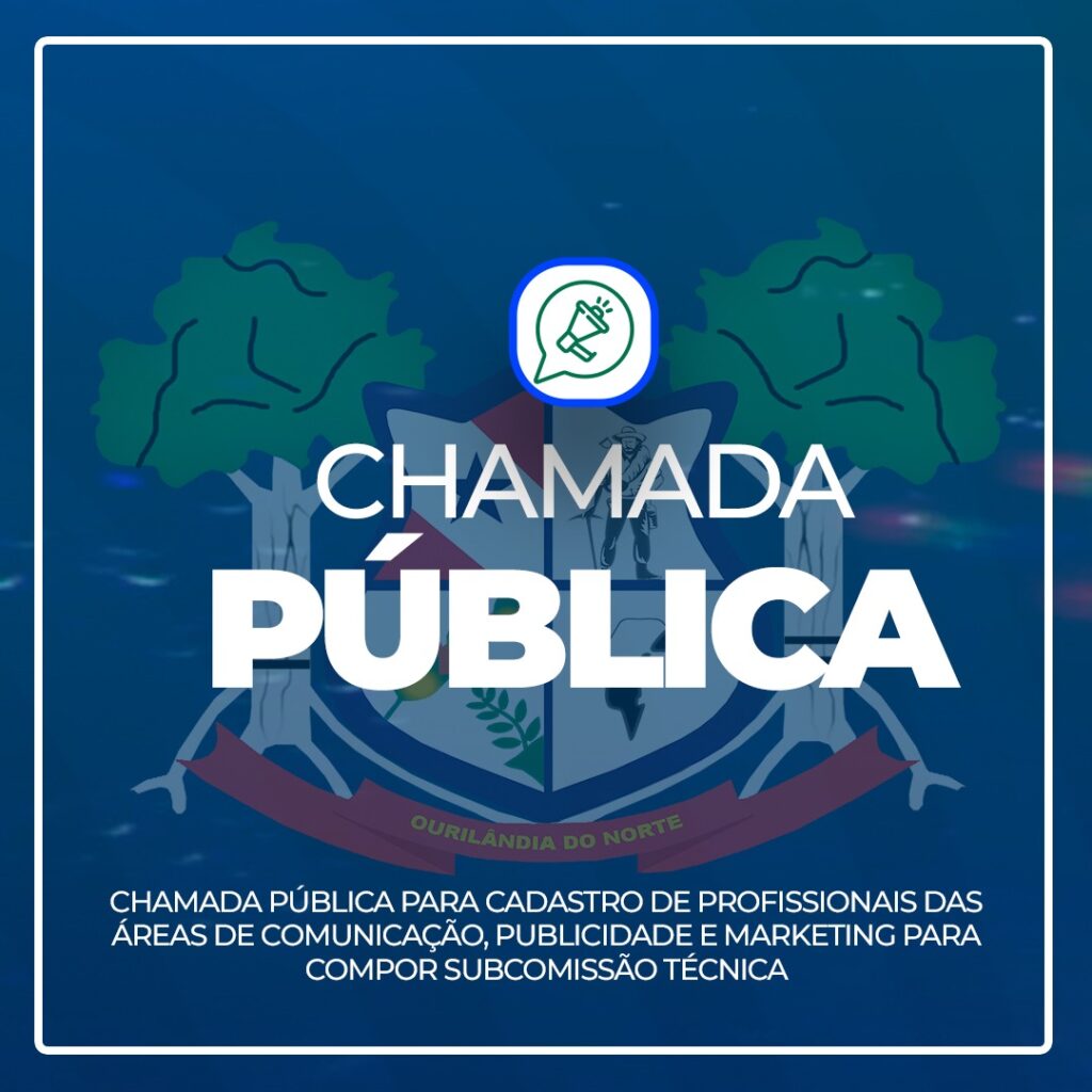 A Câmara Municipal de Ourilândia do Norte-PA, comunica aos interessados que realizará CHAMADA PÚBLICA para inscrição de profissionais das áreas de Comunicação, Publicidade e Marketing para compor (mediante sorteio de membros) a Subcomissão Técnica da futura Contratação de Agência de Propaganda em conformidade com a Lei n°12.232/2010. Os profissionais interessados deverão encaminhar a documentação necessária para o e-mail: dp.compras@ourilandiadonorte.pa.leg.br, no prazo de inscrição do dia 08/05/2025 até o dia 28/05/2025 até as 13h00min. Os interessados poderão ter acesso ao edital no site da Câmara Municipal de Ourilândia do Norte, no endereço: https://arquivo.ourilandiadonorte.pa.leg.br – Transparência/Licitações. Em 06 de maio de 2025, MARCIO OLIVEIRA DA SILVA – Presidente da Câmara.